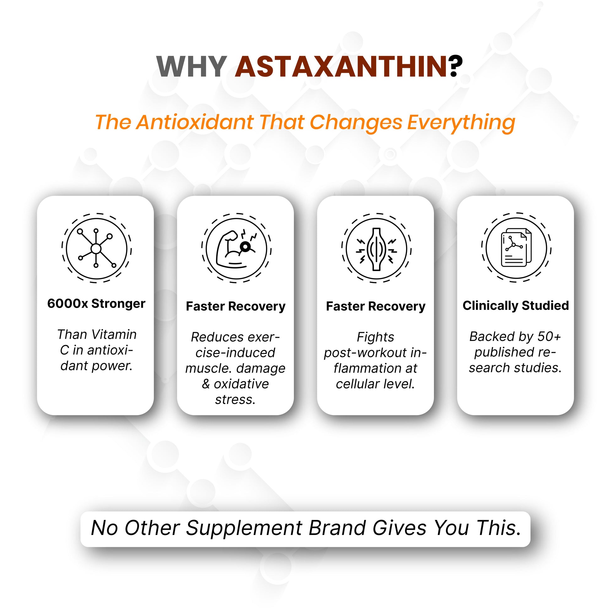 Astaxanthin neutralizes free radicals generated during intense training, reducing muscle inflammation by up to 40% and accelerating recovery so you're ready for your next session faster.