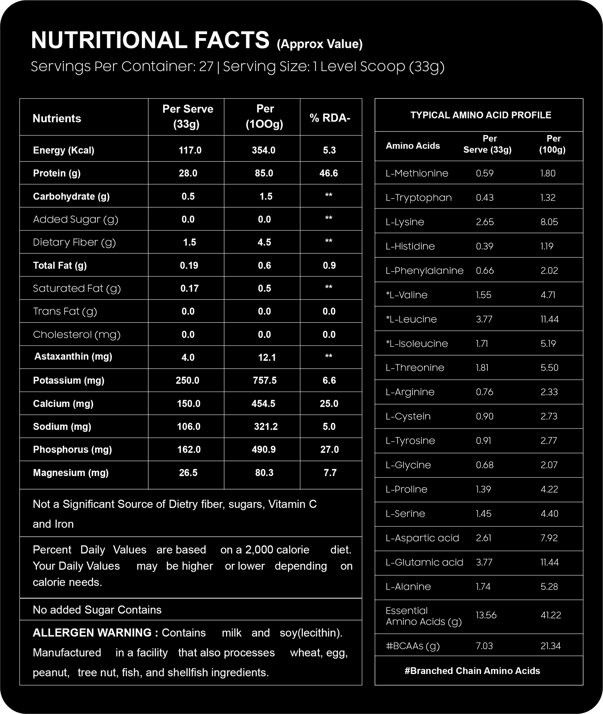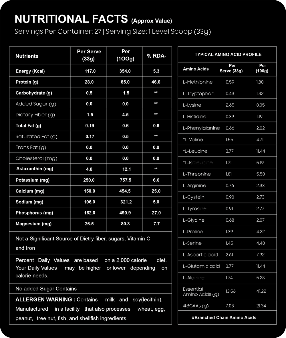28g Protein | 7g BCAA | 3.7g Glutamic Acid | 4mg Astaxanthin