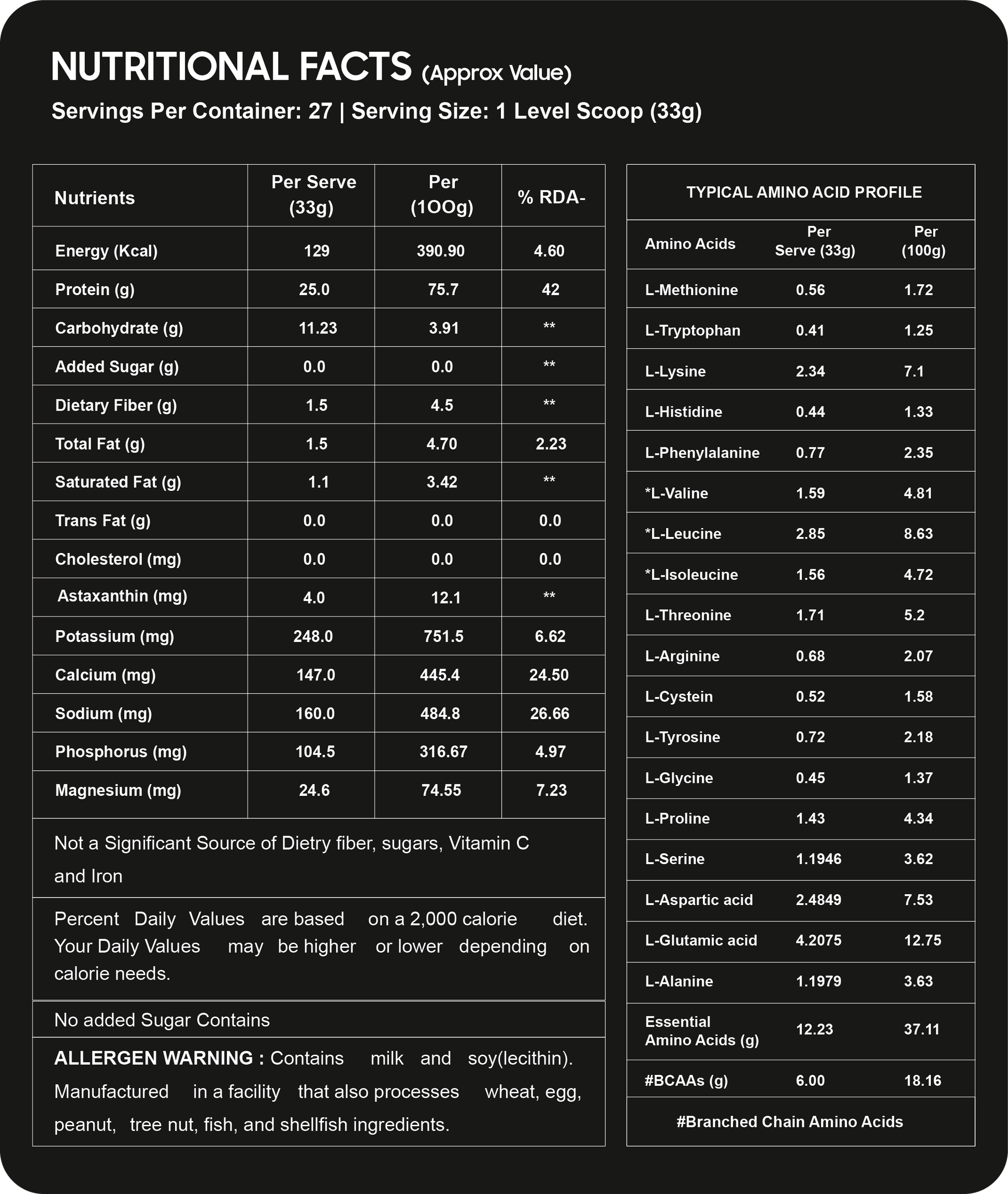 25g Protein | 6g BCAA | 4.3g Glutamic Acid | 4mg Astaxanthin